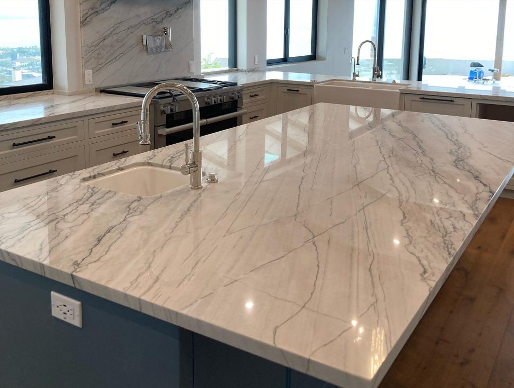Polishing works by mechanically refining the top layer of the stone using professional-grade abrasives. For marble and limestone, this process removes etch marks caused by wine, citrus, or cleaners. For granite and quartzite, polishing restores clarity and consistency.